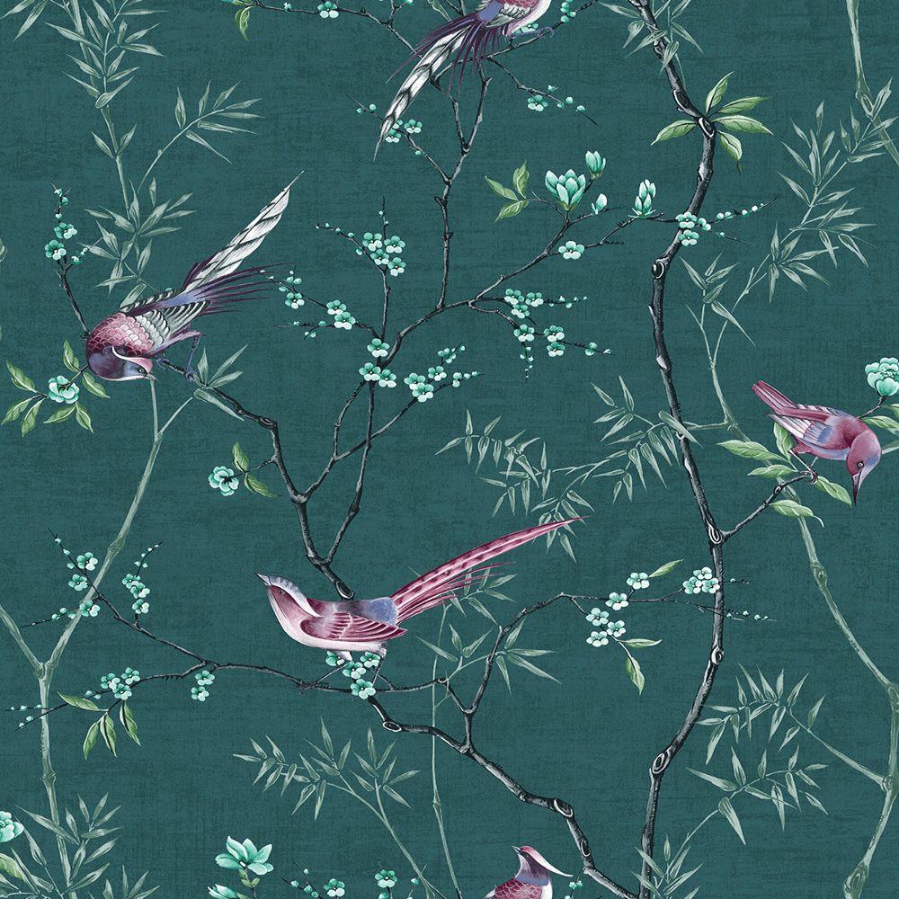 Tori depicts an exquisite Chinoiserie bird trail delicately hand painted in our studio and worked into a fine silk texture. In Eastern Art, birds are also an important and popular form of imagery and symbolism, signifying longevity, luck and love. Produced in a deep regal teal on a luxurious Oriental paper with a subtle glistening shimmer of silk.